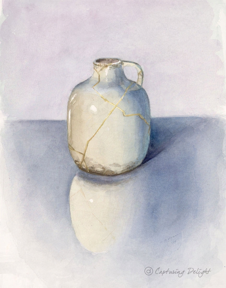 Represented here is the traditional Japanese art form called Kintsugi. It is the process of repairing broken pottery with lacquer mixed with gold. It is literally translated as "joining with gold". Apostle Paul refers to us as being earthen vessels, or jars of clay. Like Kintsugi, real beauty is seen not in the jar itself, but through brokenness. Our wounds and scars are like these cracks. And hidden among these cracks and holes, a cross glimmers and shines.