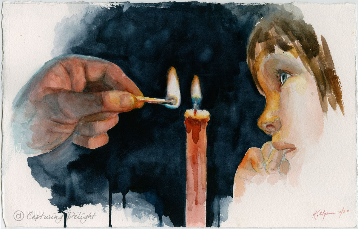 Many of us remember what it was like to be a child and to be transfixed by the beauty and mystery of a simple flame. Symbolically speaking, God uses light to draw us to Him. The verses before this passage tell us that this light is Christ. As we believe, regardless of our age, we become like children. He transforms our disbelief into wonder and into awe. This painting captures that moment when a child looks up to the holder of the flame.